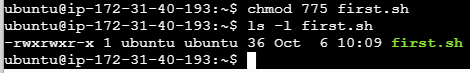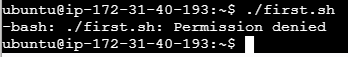 first.sh 파일의 권한이 rw-rw-r-- 으로 설정되어있다. 따라서 ubuntu 사용자로 접근하면 rw- 권하만 가지고 있고 x 에 대한 권한이 없으므로 실행되지 않는다.