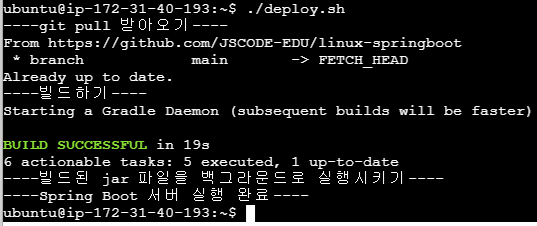 백엔드 서버를 배포하는 과정을 자동화 해보자. 수동으로 백엔드 서버를 배포할 때 입력하는 리눅스 명령어를 차례대로 쉘 스크립트 파일에 작성하면 된다.