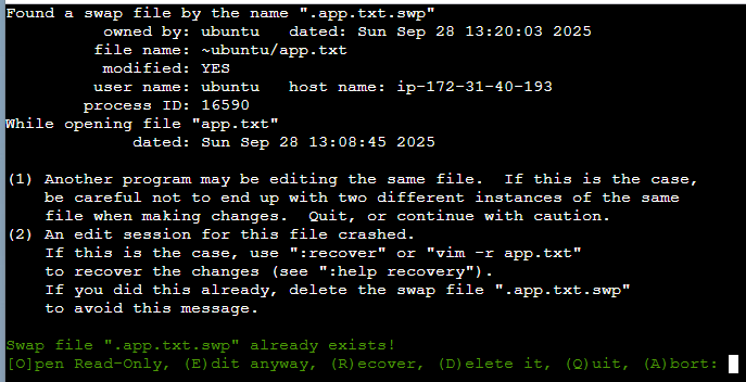기존 app.txt 파일을 열어서 텍스트를 일부 수정 중 터미널 창을 새로고침하여 다시 접속 한 뒤 vim 으로 app.txt 를 열어보자.